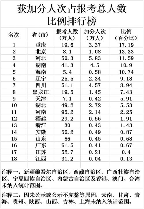 与此形成鲜明对比的是重庆、北京、河北等地。2010年重庆市高考报名人数为196759名,是全国仅有的四个增加人数的省市之一。重庆今年高考加分人数为3.37万人,占考生总数约17.19%。从获得加分的几率来说,重庆是江西的约130倍。即使减去占大头的少数民族考生13000多人,仍有两万多人获得其他项目加分。