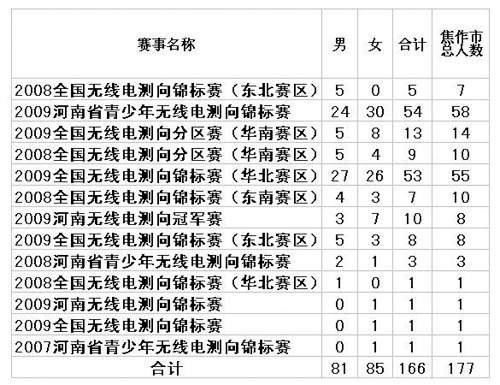 焦作一中及其分校学生近年参加无线电测向比赛获得国家二级运动员的人数。根据《2010年河南省普通高等学校招生报考高水平运动员花名册》参赛信息统计。