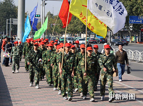 中新网11月3日电 (记者 翟羽佳)今日,石家庄街头迎来一支身穿迷彩服,头戴小红帽,身背行军壶的特殊行走队伍——“问题孩子”训练营。他们将在组织方的带领下徒步到达山东泰山,以磨炼意志,摒弃陋习。