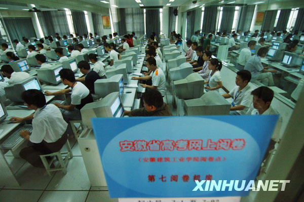 资料图片:6月14日,在安徽建筑工业学院阅卷点,阅卷老师正在紧张评卷。新华社记者李健 | 今年高考北京地区语文阅卷工作17日结束。据参与阅卷的老师介绍,高考语文作文阅卷中,既有满分作文,也有零分作文,约4%考生的作文得分高于55分,大部分考生的作文成绩在39分-50分之间。目前,语文阅卷进入核实和分数登记阶段。