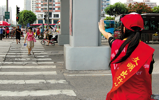 志愿者正尽责阻止行人冲红灯