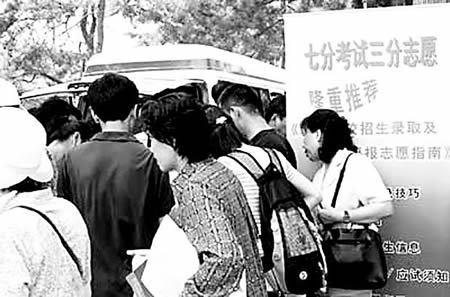现在有部分农村考生家长等自己的孩子一走出考场,便带着大包小包进城求人。他们求人的根本目的,不单是希望能填好志愿,更多希望“攀高”。江苏省教育厅一位处长无奈地告诉记者,他的应酬饭局10天之内都安排满了。另一种极端是只相信成绩,不注重填报志愿。采访中一位家长满不在乎地告诉记者:“只要分数考得高,填不好表也能上好学校。”事实上,填报志愿很重要。记者手头有一份去年考生的志愿表:李某,江苏考生,623分,一本的第一志愿清华大学,其他平行志愿以及是否服从全部空白。二本第一志愿为本省一家学院,其他全空白。由于“空白”属于“不服从”,所以该生被那家学院录取。后来该生拒绝报到,今年又一次参加高考,现在估分为546分,注定上不了清华那样的名牌高校,所以很失落。这完全是不重视填报志愿的后果。