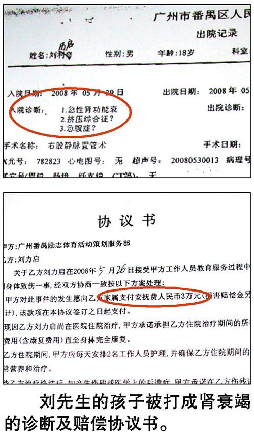 与杨先生同病相怜的还有东莞的刘先生,他的孩子在去年5月26日送进一个训练营,训练期也是三个月,缴费13100元,而30日孩子便被送进医院,经医生诊断为殴打、缺乏饮用水造成的肾衰竭。刘先生说,训练营的训练内容“基本上没有心理辅导,只有少得可怜的法制教育,其余的全部都是‘生理辅导’和军事训练”。