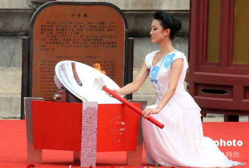 8月28日上午,北京残奥会圣火采集仪式暨火炬接力启动仪式在北京天坛举行,圣火采集使者、中国残疾人艺术团的姜馨田,将引火棒对准凹面镜,霎时火苗跃起,残奥会圣火成功采集。中新社发 张宇 摄