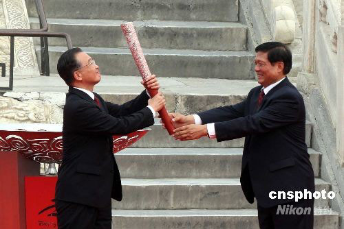 国务院总理温家宝(左)从北京奥组委主席刘淇手中接过残奥会火炬,准备点燃圣火盆。中新社发 张宇 摄