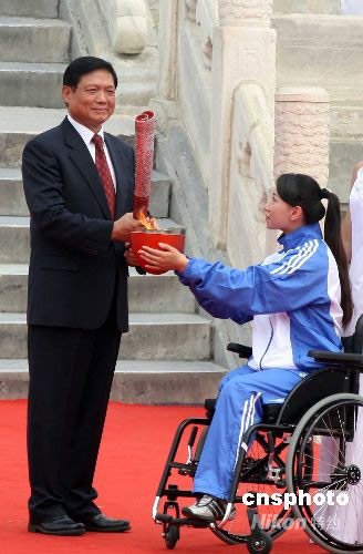 北京奥组委主席刘淇从残疾人运动员金晶手捧的火种盒中点燃残奥会火炬。中新社发 张宇