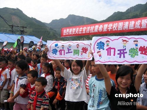 四川地震灾区最大的“抗震希望学校”8月31日举行了开学典礼,这标志着包括四川、甘肃在内的地震灾区一百六十多所抗震希望小学和希望学校已经准备好接纳新学年入学的十万余名中小学生。这所位于四川广元青川县关庄镇的“宝洁抗震希望学校”共有校舍九十七间活动板房,其中教室三十一间,每间教室可容纳学生五十人,剩下的活动板房主要为学生宿舍。 中新社广元八月三十一日电 (记者 孙宇挺)四川地震灾区最大的“抗震希望学校”三十一日举行了开学典礼,这标志着包括四川、甘肃在内的地震灾区一百六十多所抗震希望小学和希望学校已经准备好接纳新学年入学的十万余名中小学生。