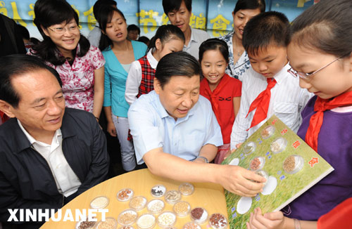 在认识粮食、节约粮食体验活动区,有的小学生在识别不同种类的粮食,有的小学生在学做豆浆、面筋,有的小学生在通过试验分辨新米和陈米。习近平等中央领导同志来到孩子们中间,同他们一起做起了实验。习近平语重心长地对小学生们说,你们在课堂上学习过“谁知盘中餐,粒粒皆辛苦”的诗句,但还要通过大量的社会实践,才能真正感悟到这句诗的含义。希望同学们利用节假日多到农村体验生活,更好地认识我们的国情、民情,更加自觉地节约粮食。