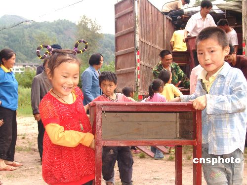 资料图:8月25日,重庆市石柱土家族自治县总工会通过多方努力,把80套崭新的单人桌凳送到该县最偏远的枫木乡风竹小学,取代了该县最后一批用高板凳当桌子、长木凳当椅子的“板凳课桌”。自“两基”、“普九”工作开展以来,重庆市石柱土家族自治县狠抓教育投入,着力巩固“普九”成果,一批又一批不规范的学生课桌被标准的单人桌凳代替。 中新社发 谈天 摄