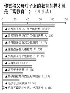 你觉得父母对子女的教育怎样才算是“富教育”?调查中,82.6%的人认为应该培养孩子独立、负责的性格,其次是重视孩子日常行为习惯的培养(72.9%),再次是培养孩子自食其力的意识(72.7%)。此外还包括:注重孩子的人格教育(71.6%),发掘孩子的个性和特长(66.8%),以身作则(53.8%),让孩子多读书(47.1%),孩子的教育开支绝对不能省(32.3%),带孩子出去旅游(26.9%),仅有3.2%的人选择“给孩子富足的生活、学习条件”。