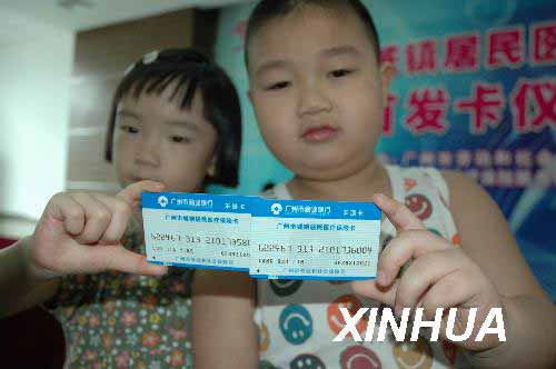 资料图片:2008年7月22日,广州市“小市民”唐浩林(右)和罗嘉滢作为未成年人代表,领取了作为参保居民身份象征的“医保卡”,这是他们在展示自己的“医保卡”。当日,广州市向参加城镇居民基本医疗保险的参保人代表发放首批6.3万张“医保卡”,广州将基本实现医保“全覆盖”。广州市老年居民、非从业居民、未成年人及在校学生均纳入医保体系,约150万人将从中受益。新华社记者 杨霞 摄