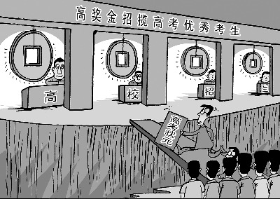 2009年高考招生进行时,“只要高考成绩居浙江省文、理科前100名,第一志愿报考我校,就可获得20万元的重奖。文科前150名、理科前200名,奖励15万元……浙江以外省、市、区文科前1000名、理科前2000名的考生,奖励大学本科期间学费……”浙江师范大学发布的该招生消息一石激起千层浪,专家、家长、考生、网友议论纷纷,观点各异。有支持者,坚持认为应该给浙江师大“巨奖招生”一些掌声,认为这是在对教育资源过度集中的纠偏;有反对者,坚持认为奖励高分新生的钱没有用在“刀刃”上,称用高额奖学金吸引高分考生的做法实际是一种“不公平竞争”。