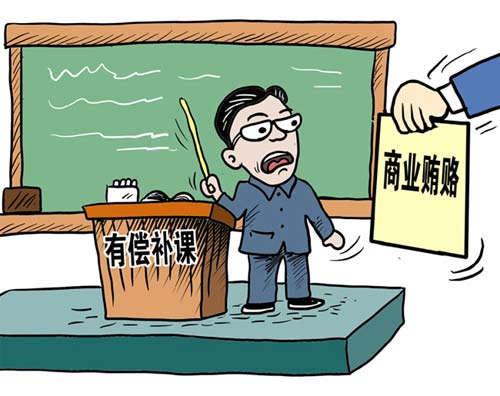 湖南衡阳市教育部门规定,各中小学一律不得自行组织或假借短期教育培训机构名义组织学生上任何培训班,并明确规定教师在组织学生补课中收受好处的以商业贿赂论处。 漫画作者:朱慧卿 图片来源:扬子晚报网