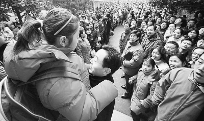 ③南京奥数考场门口接孩子的家长太多,工作人员将孩子抱起,让家长认领。(人民图片)