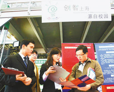 资料图片:大学生创办企业首次走进上海国际工业博览会。十一月七日,来自复旦大学法律系的学生肖建依(左三)正在向客商介绍有关知识产权和法律服务的项目。 来源:中国青年报 记者 屠知力摄