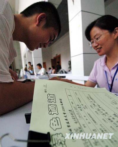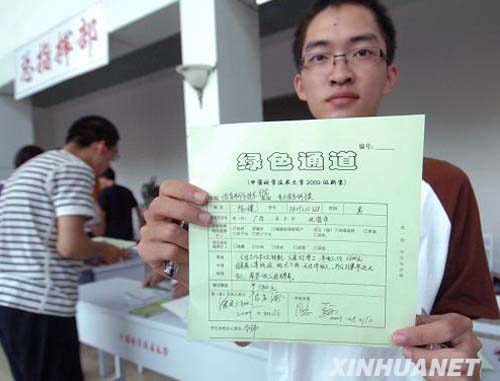 8月15日,来自四川的中科大少年班新生杨洋(左)在中国科技大学“绿色通道”前办理入学手续。 当日,教育部开通2009年高校学生资助工作热线电话,接受政策咨询和问题投诉,确保家庭经济困难学生顺利入学并顺利完成学业。热线电话自8月15日8:00至9月15日17:00开通,电话号码为010-66097980和010-66096590。新华社发(刘军喜 摄)
