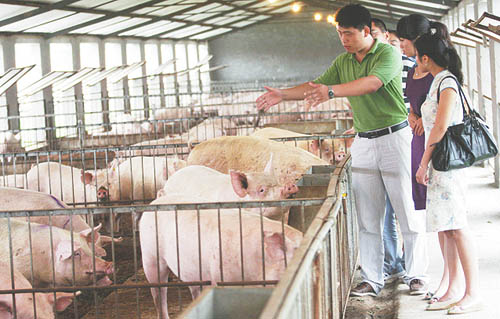 河北省迁安市野鸡坨镇大山庄村村主任助理徐达正在和前来村里参观的应届大学毕业生们交流自己的养猪经验。记者 陈剑摄