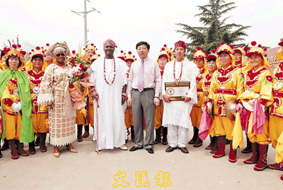 尼日利亚阿卡姆土王夫妇与房一波(持证书者)合影。(香港《文汇报》)