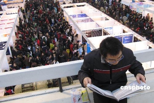 2月16日,一年一度的北京最大规模的招聘盛会——2008年春季人才大市场招聘会在北京中国国际展览中心举行。图为一名寻求职位的应聘者在会场闹中取静查看人才信息报纸。此次招聘大会提供职位2万余个,前来求职人员约10万人次。招聘项目分为奥运专区及知名企业、生物医药及广告传媒、IT、电子、通讯、外企、综合招聘、高新技术与自主创新等行业。 中新社发 邹宪 摄