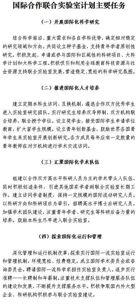 为落实《国家中长期教育改革和发展规划纲要(2010-2020年)》,加强与国外高水平大学合作,建立教学科研合作平台,联合推进高水平基础研究和高技术研究,提高创新人才培养质量,决定依托高等学校整合提升并建设认定一批国际合作联合实验室(以下简称联合实验室),在建设模式、科研组织、人才培养、考核评价等方面推进机制创新、改革试点,以深化教育改革、扩大教育开放,提升高校原始创新能力和国际学术声誉,加速世界一流学科和世界一流大学建设。