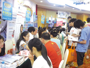 今年10月,南京多家留学机构举办了留学教育展,邀请到众多世界名校来宁招生。从现场来看,记者走访的几家教育展上,学生和家长的人数都远远少于校方招生代表的数量,来自墨尔本大学的招生官员表示,10月他们已经在南京参加了几场教育展,来咨询的家长以熟面孔居多。为了吸引现场签约,举办教育展的机构更是屡出新招,奖品由签约打折、抽奖,发展为到现场听讲座回答问题也能得到半价优惠,可谓是不惜血本赚吆喝。 记者在几场展会现场均遇到一位李姓家长,他告诉记者,展会逛下来的收获不小,但是最大的感受是,大家办的展会都比较雷同,没有新意。邀请来的学校也大同小异,就展会本身来看,没有大的区别。现在家长选择机构也是要慎重考虑的,现场签单的优惠,都是可有可无的噱头,等和这几家机构深入交谈之后,才能决定选择哪家。记者在现场选取了一些有代表性的情况供有留学意向的学子和家长参考。