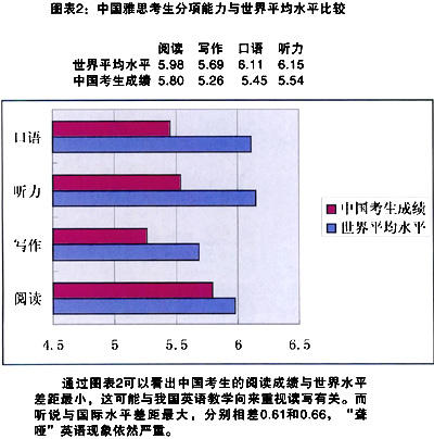 通过图表2可以看出中国考生的阅读成绩与世界水平差距最小。这可能与我国英语教学向来重视读写有关。而听说与国际水平差距最大,分别相差0.61和O.66,“聋哑”英语现象依然严重。