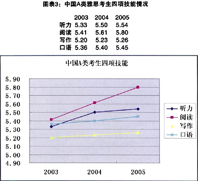 从图表3可以看出中国A类雅思考生的阅读在过去三年中进步最大,而写作、口语提高缓慢。口语和写作的确是中国考生的软肋。就口语而言,虽然我国的英语教育越来越重视听说能力,交际教学法也越来越流行,中国英语学习者的口语水平依然是提高缓慢,没有太大的起色。导致这种结果的原因有很多,有大环境方面的,也有具体的英语学习法方面的。考生无法很好地完成考试四大评分标准的要求无疑直接导致了口语成绩不理想。