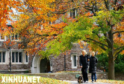 11月17日,在美国常青藤盟校普林斯顿大学,行人在校园内漫步。 美国常青藤盟校不但以学术水平著称于世,其校园风光也闻名遐迩。在深秋暖阳的照耀下,校园优美如画。 新华社记者侯俊摄