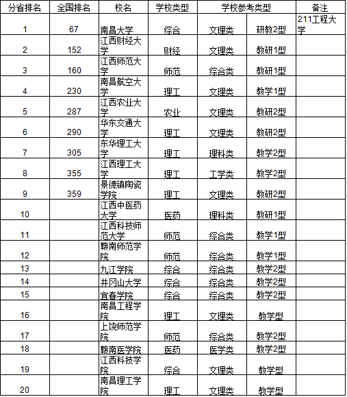 江西省面积16.7万平方公里,2012年人口4504万人,人均GDP28800元。截止2009年,共评价20所普通本科大学,其中211工程大学1所。教师25295人,在校博士生674人,硕士生17470人,普通本科生288428人,留学生1241人。