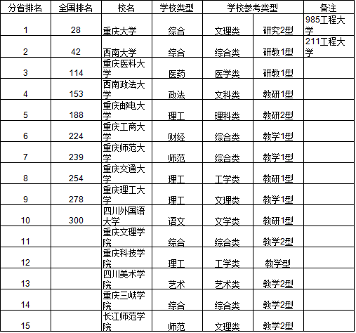 重庆市面积8.24万平方公里,2012年人口2945万人,人均GDP38914元。截止2009年,共评价15所普通本科大学,其中985工程大学1所,211工程大学1所。教师18818人,在校博士生4616 ,硕士生33730人,普通本科生255776人,留学生1632人。