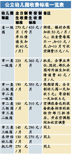 据介绍,公立幼儿园是属于全市收费最规范的层次,因为按物价局规定,省一级、市一类园、市二类园、市三类园和未评估的幼儿园、托儿所,都有明确的收费标准。公立园的每项收费、标准及收费许可证都须公示在公布栏。不过,这一层次也是目前全市幼儿园中最少的。