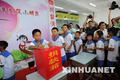资料图片:8月26日,四川双流县新棠湖小学,四川地震灾区孤困儿童捐上自己的零花钱。当日,集中安置四川地震灾区孤困儿童的安康家园新棠湖小学的一些小朋友们为台湾灾区小朋友捐钱、捐物并送去祝福。新华社记者 江宏景 摄