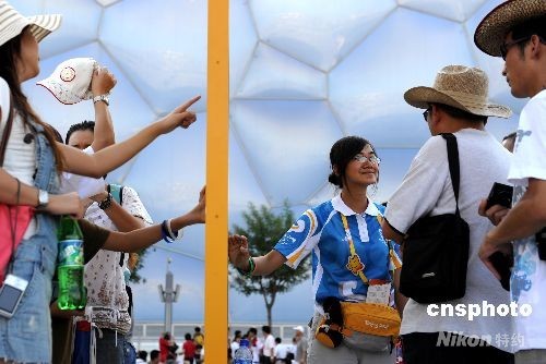 资料图:北京奥运接近尾声,水立方前的奥运志愿者热情为观众指示观赛路线。
