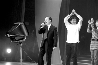 略显紧张的周校长“喝口水”的要求得到满足后,便从衣袋里掏出一张写有歌词的白纸,正式开唱。他手握麦克风,紧盯台上的卡拉OK屏幕,高潮处他还会踮起脚尖“飙高音”。此时,上任校长许智宏微笑着坐在台下,随声轻和。