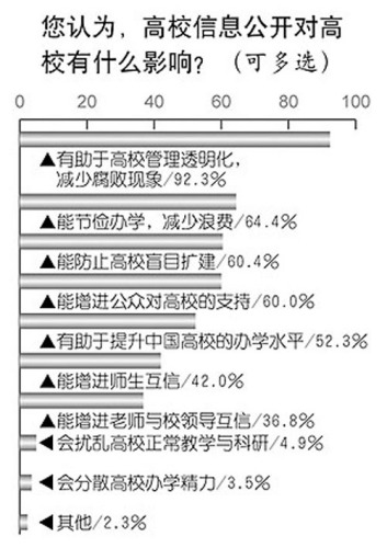 本次调查显示,92.3%的公众认为高效信息公开能使高校管理更加透明,减少腐败现象;64.4%的人认为能节俭办学,减少浪费;60.4%的人认为能防止高校盲目扩建,减少债务;60.0%的人认为能够增进公众对高校的支持。