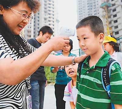 资料图片:8月31日,北京朝阳区八里庄中心小学,学生们在校区口接受体温测量。来源:人民日报 记者 徐 烨摄