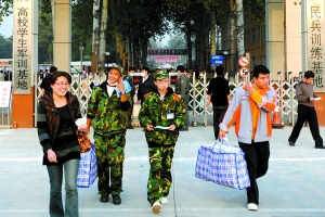 昨日,两名军训新生在亲友的陪同下离开基地。27日,北航一名大一新生军训期间患甲流身亡。 记者 张汉宇 摄