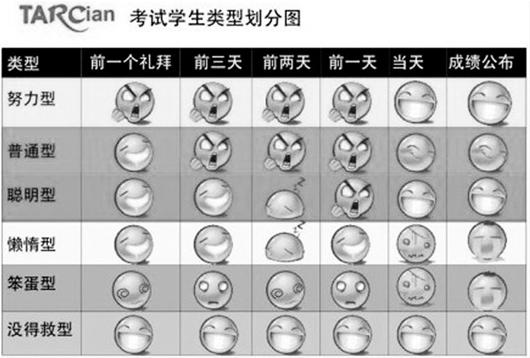 记者在武汉科技大学城市学院帖吧里看到了这张图,它以头像表情的形式反映了不同类型的学生考前考后的状态。比如,努力型考前一周就开始奋斗,考试当天以及成绩公布后都十分轻松、开心;懒惰型考前只顾玩乐,结果考试当天傻了眼,成绩公布后泪流满面;聪明型只用考前一天突击一下,便能笑对考试;没得救型则是从考前到成绩公布后都乐呵呵的。
