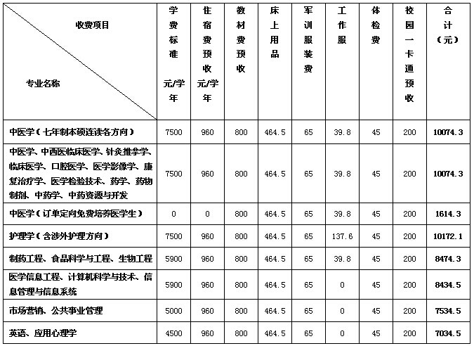7、以上表格中所列中医学七年制本硕连读专业的学费为本科阶段收费标准,将来硕士阶段的学费按届时湖南省物价局相关规定执行。