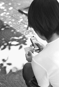 照片:中国传媒大学校园内一女生正在用手机短信传送考试答案。吴思强摄