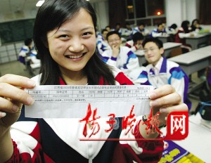 在经过近20天的热切等待后,昨天晚上7点左右,金陵中学河西分校高二的学生第一时间从班主任手中领到了用A、B、C、D不同等级记分的成绩通知单。记者在现场发现,面对不同的成绩,有人喜笑颜开,有人则难过地把头埋在了书堆里。“4个A!”心情很好的程同学得意地展示自己的成绩单。他把自己成功的原因归结为两点:一是去年小高考很多人都栽在了政治上,自己的政治也一向不好,因此就在政治上狠下了工夫,该背的该理解的都没有落下;二是他觉得今年文科考题确实偏简单。不过考了3A1B的小康拿到成绩单后却很失落。“今年考试一没想到物理化学这么难,二没想到自己的强项化学居然只拿了B。”不过难过归难过,康同学说没有4A已经是既定事实了,下面要把重点放在另外五门上。不过记者发现,对于定位于过关性考试的小高考,这次有学科没过关的学生压力是非常大的。一位姓吴的同学就栽在了生物上。“我心里很不好受,别的同学现在开始就可以全心备战高考了,而自己还要参加明年的生物补考。”