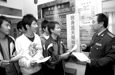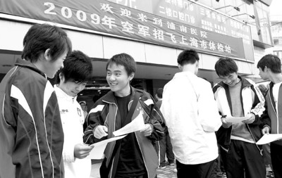 日前,浦东新区浦南医院门诊部楼前彩旗招展,人声鼎沸。由上海市卫生局、上海市教育考试院、空军招飞工作局南京选拔中心共同主办的“2009年空军招飞上海市体检站”在此正式开检。 “一人参军,全家光荣”,650余名上海市应届高中毕业生踊跃报名参加了招飞体检。