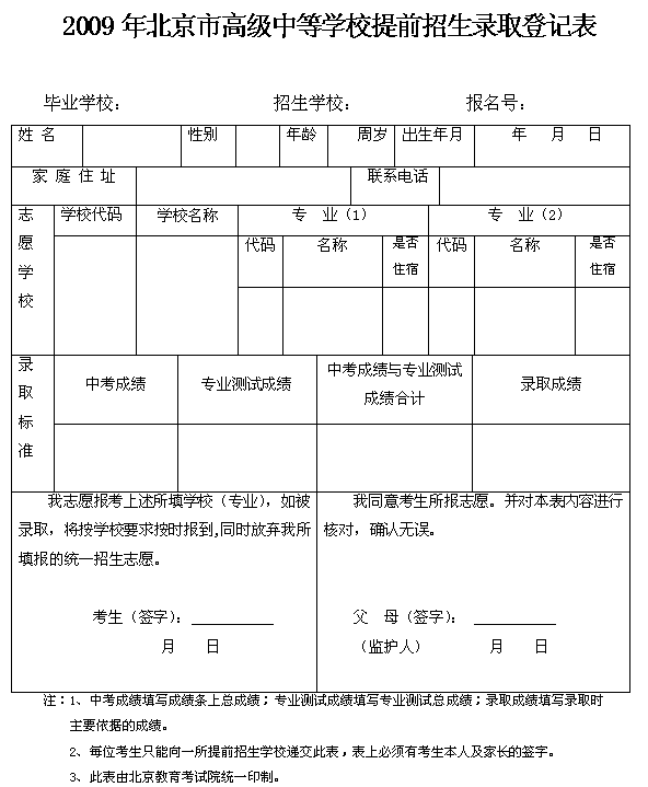 2、2009年北京市高级中等学校提前招生录取登记表