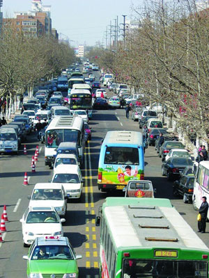 资料图片:2008年青岛理工大学附近的抚顺路两旁停满了艺考陪考的车辆。