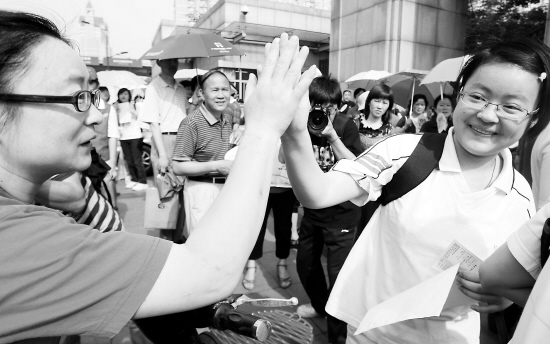 杭州高考点,母女击掌为高考加油。