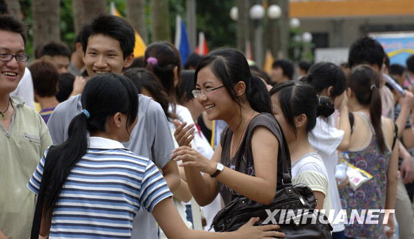 6月9日,海口第一中学考点的考生在结束最后一科考试后相互交谈。