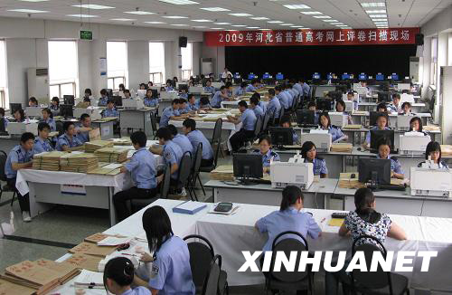 日前,媒体受邀走进2009年高考网上评卷现场,了解了高考网上评卷的全部流程。截至目前,全国各省区市已全部进入高考评卷程序。这是一个壮观的场面——3000人面对电脑、目不转睛,评判55.78万名考生的220万份高考试卷。据介绍,网上评卷是运用计算机网络技术和电子扫描技术将纸介质答卷扫描生成图像,选择题部分由计算机对考生填涂的信息点比对标准答案自动给分,非选择题部分由评卷教师在计算机网络上对考生的答题图像进行评阅给分。