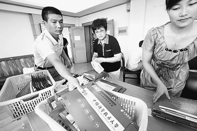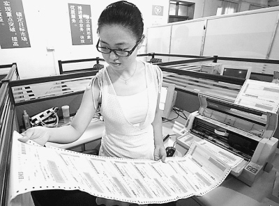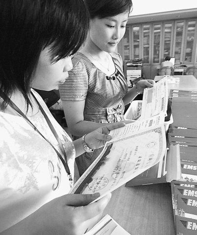 高招录取开始后,中国科技大学的招生老师,就进入校园内封闭的招生办公室,通过计算机进行新生远程录取(图①)。一个批次录取结束后,即把所有考生的地址、姓名、邮政编码、电话等有效信息,提供给合肥市邮政速递物流公司。邮政部门将地址信息与内部的全国邮路名址信息比对后,就开始打印各位考生的名址(图②)。随后带着这些打印好的面单,以及大红的信封,再次进入高招录取现场。邮政员工先要会同科大招生人员,再次核对收件人的地址是否准确,从源头上杜绝疑难录取通知书的出现(图③)。然后在信封上贴上收件人的名址,里面装上录取通知书和银行卡。装好后,才开始往信封内填装学生手册、费用清单、行李托运单等资料,封装完毕(图④),确保考生收到通知书。