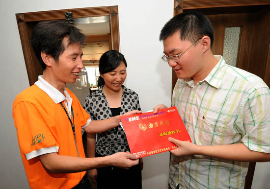 资料图片:7月29日,邮递员(左)将南京大学录取通知书送到家住南京市江东北路的考生金刈非手中。新华社记者 孙参 摄