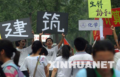 8月26日是清华大学2009级大一新生报到的日子,各系的师哥师姐们举起牌子迎接新生。新华社发